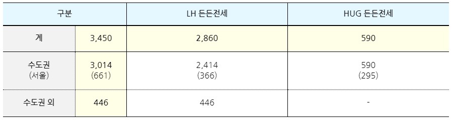 현재 LH는 2,860의 물량을 확보했다고 합니다. HUG는 경매낙찰받은 590의 물량을 확보하였다고 합니다. 이 중 수도권인 서울의 물량은 LH는 366, HUG는 295입니다.