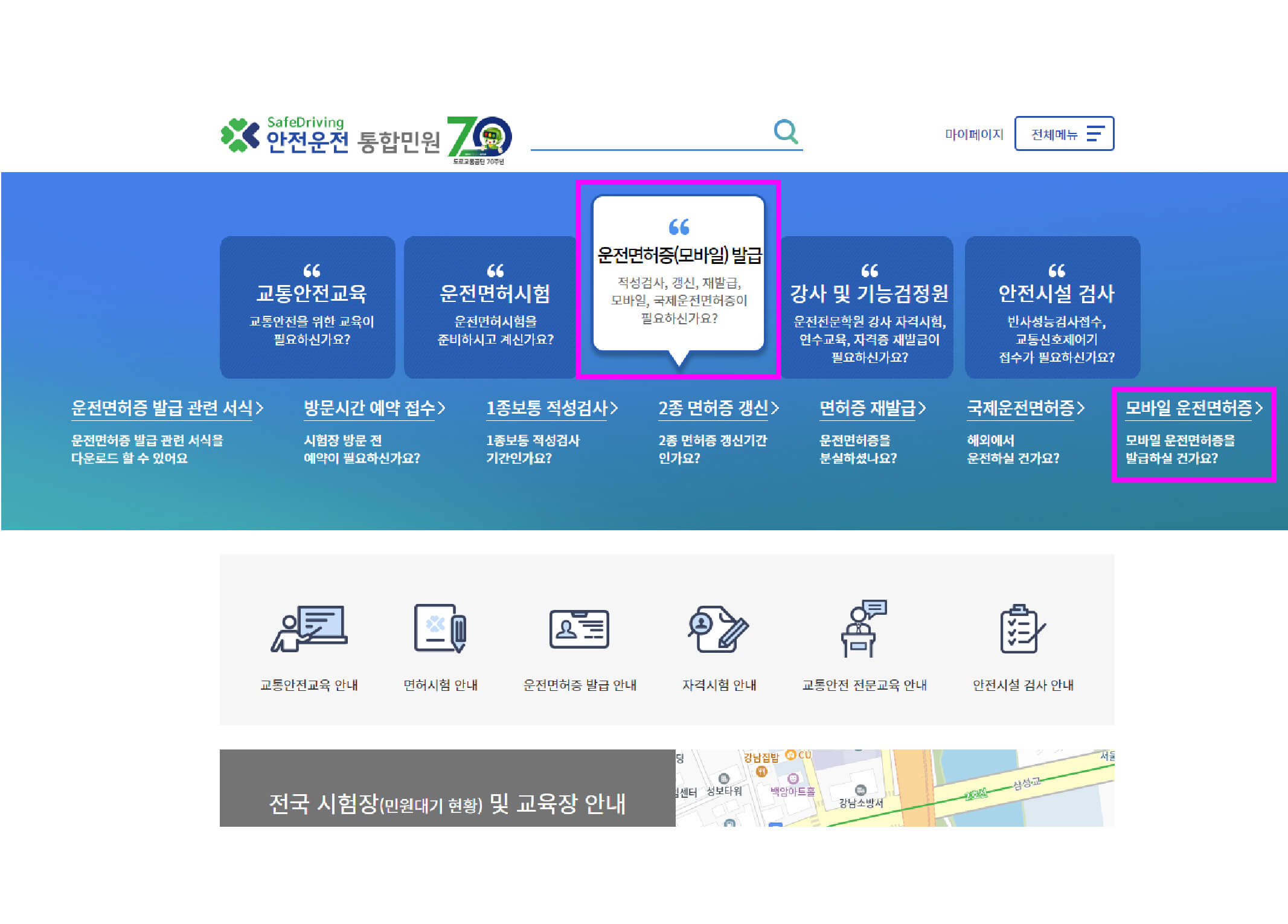 상단 메뉴 운전면허증(모바일) 발급 -> 하위 메뉴 모바일 운전면허증 클릭
