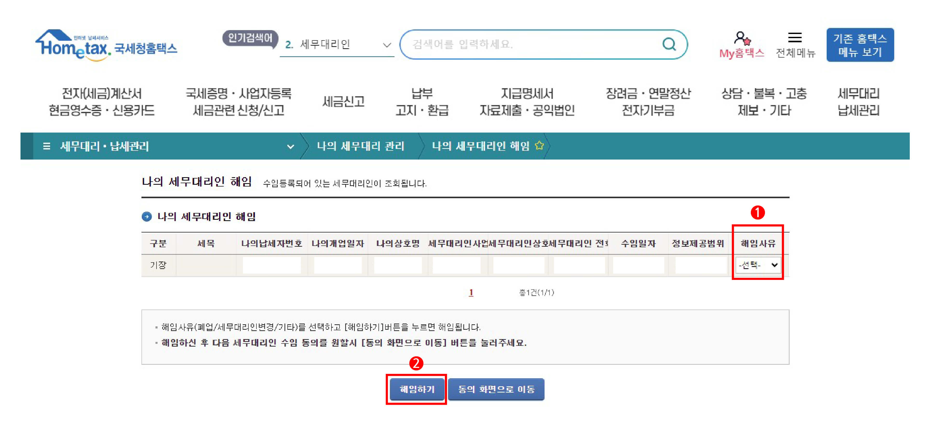 🟢 상단의 전체메뉴 -> 세무대리 납세관리 -> 나의 세무대리 관리 -> 나의 세무대리인 해임 클릭