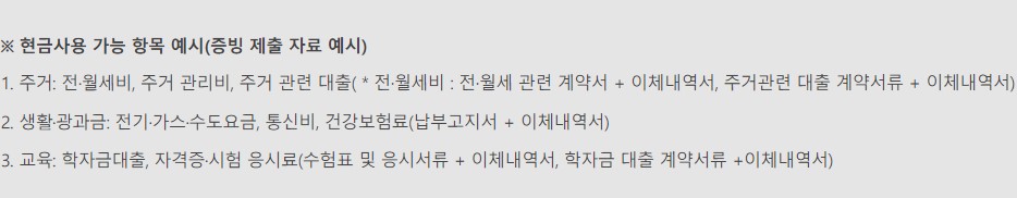 사용이 가능한 곳과 불가능한 곳이 구분되어 있습니다. 사용전 반드시 확인하시고 사용하셔야 불이익이 없습니다. 사용 후 증빙자료를 제출해야 하는 항목도 있으니 반드시 사용처 안내를 확인하시기 바랍니다.