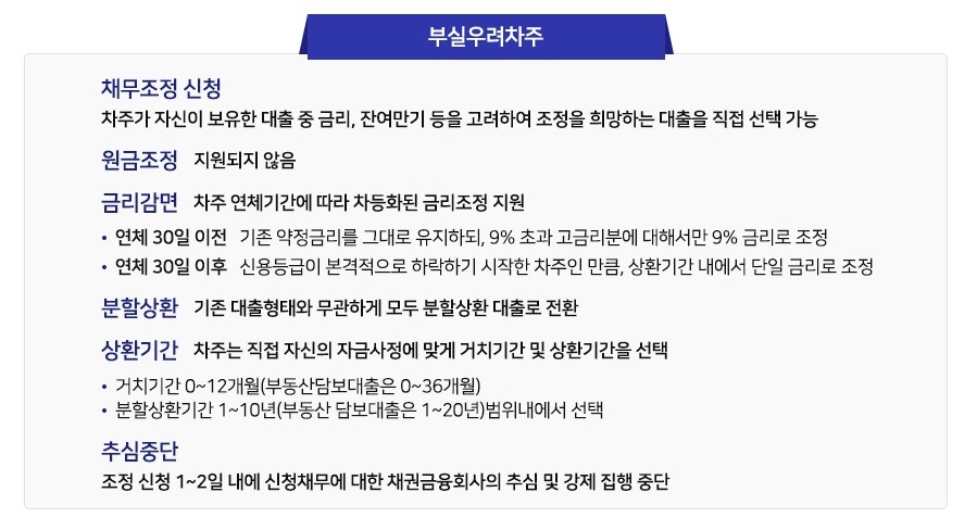 부실차주는 이자와 연체이자 감면 부실우려차주는 연체기간에 따라 차등화된 금리조정 지원이 됩니다. 부실우려차주의 경우 연체 30일 이전이라면 기존 약정금리를 그대로 유지하되, 9% 초과 고금리분에 대해서만 9% 금리로 조정이 가능하며 또한 연체 30일 이후 신용등급이 본격적으로 하락하기 시작한 차주는 상환기간 내에서 단일 금리로 조정이 가능합니다.