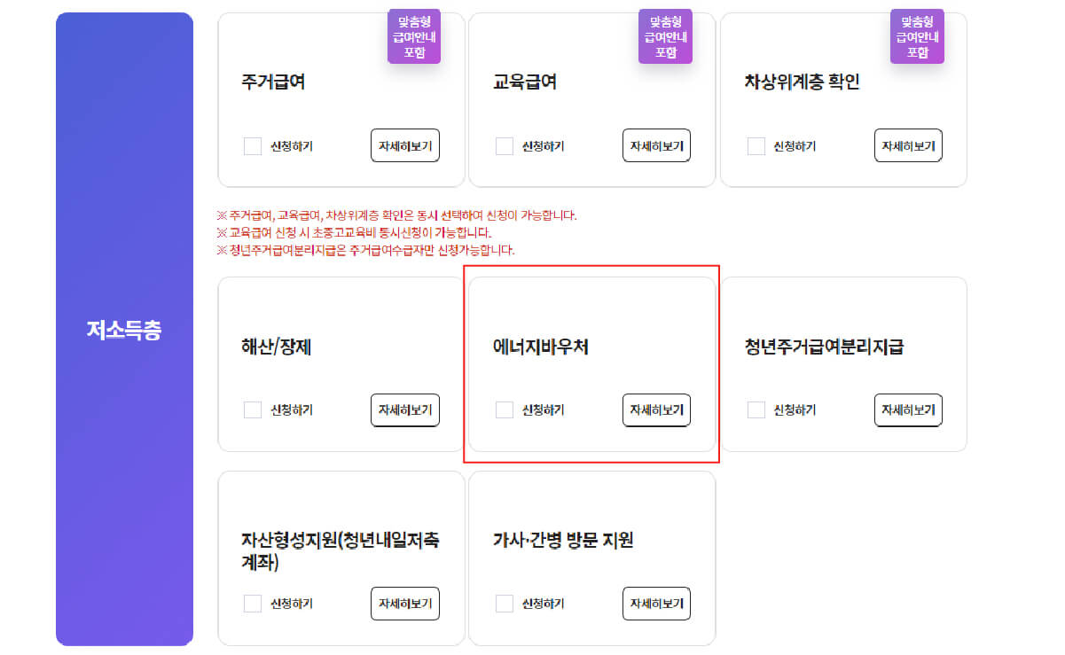 - 하단에 스크롤을 내려 저소득층 - 에너지바우처를 선택합니다.