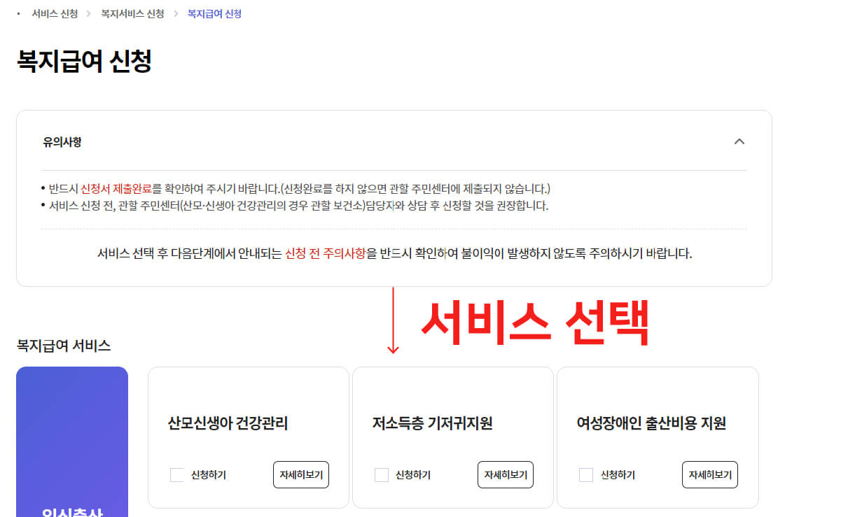 - 상단 메뉴의 서비스 신청 -> 복지서비스 신청 - 복지급여 신청 클릭