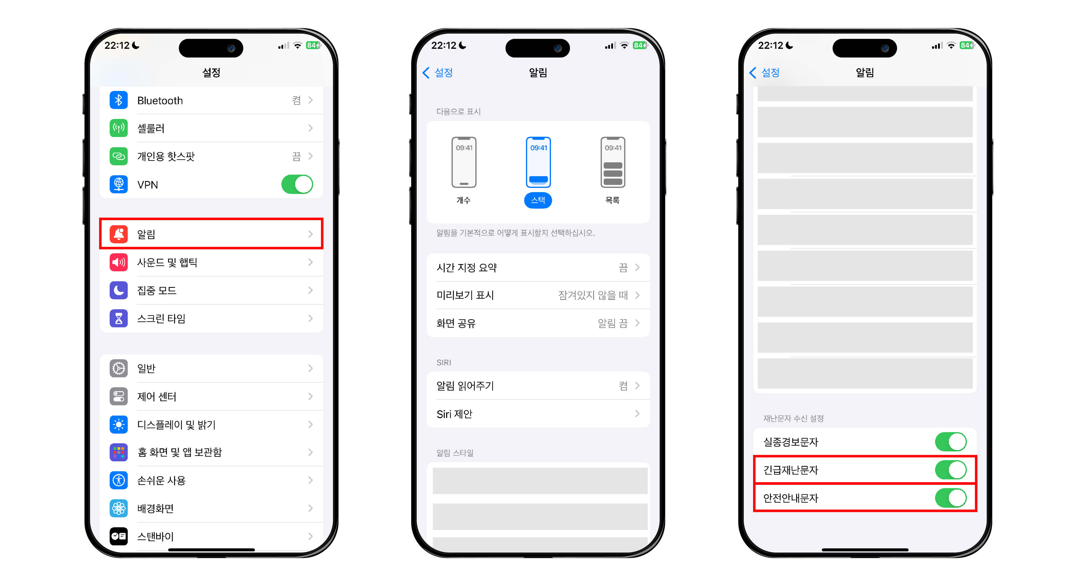 - 설정 -> 알림 -> 화면 맨 하단 스크롤 -> 경보 유형을 켜거나 끕니다.